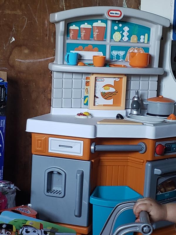 Your little chef can sort shapes on the refrigerator open oven doors set a working timer cook sizzling bacon in a pan boil water in a pot and watch toast spring out of the toaster in this little tikes kitchen.